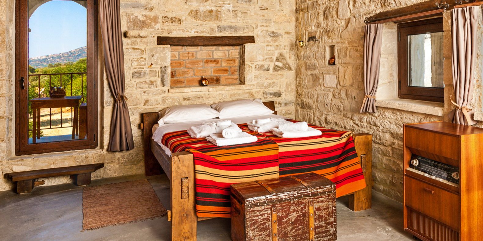 You will find a double wooden bed made of pieces of the old loom. In the room, there is a small wooden table and the minced meat machine used in the past. Also there is a 60 year old radio. The toilet is 50 meters outside the house where you can have your shower and relax on the outdoor bed for a relaxing summer night, under the starry sky.